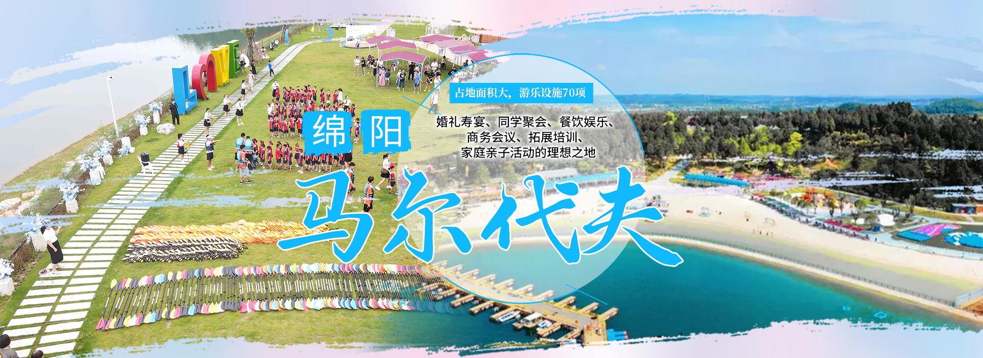 綿陽嘉成文化旅游有限公司是一家旅游開發公司,成立于2019年。 親水灣沙灘樂園項目由綿陽嘉成文化旅游有限公司開發運營,位于國家級水利風景區——綿陽市仙海水利風景區,距綿陽市區15公里,車程約半個小時,是依托沉抗水庫建設的仙海風景區重點旅游項目。進入仙海風景區上坡向左進入環湖路前行1000米。項目總占地220畝,其中核心沙灘樂園占地100畝,現建成沙灘休閑、淺灘嬉水、水上運動,親子蹦蹦云、網紅多人秋千、人力過山車、水幕秋千、團隊拓展等項目十余個,還開設有特色中餐、仙海火鍋魚,自助燒烤等飲食項目。 近觀青山綠水,遠眺碧波蕩漾,清晨朝霞映翠、傍晚水天一色。親水灣沙灘主題樂園有可容納200人的沙灘會議室和30人的小型會議室;棋牌室16間; 商務KTV;餐飲中心可同時容納300人用餐;篝火晚會場地等,是婚禮壽宴、同學聚會、餐飲娛樂、商務會議、拓展培訓、家庭親子活動的首選之地。